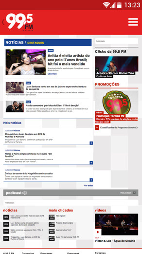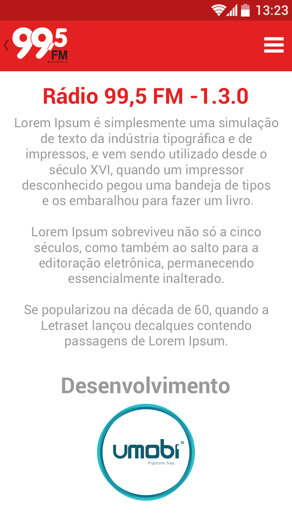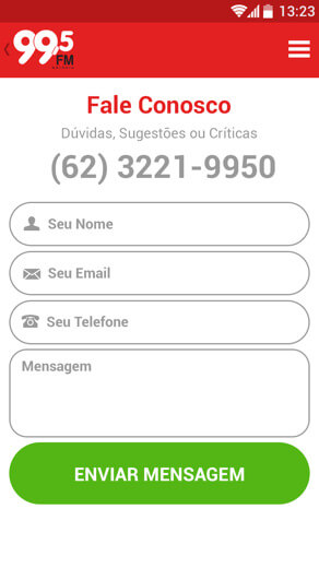 O aplicativo da Rádio 99,5 FM permite aos ouvintes acompanharem a rádio em tempo real em qualquer lugar, além de poderem participar de promoções e interagir com a programação e locutores, via mensagens SMS,ou internet. Com player de áudio com controle de volume via "gestures", pausa em chamada e auto play após o seu fim.